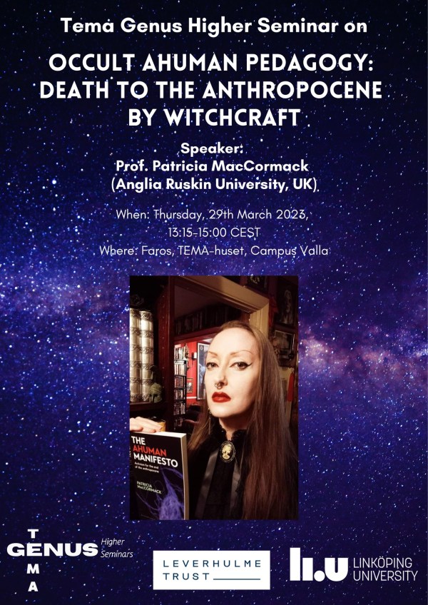Invitation: Tema G Higher Seminar with Prof. Patricia MacCormack on “Occult Ahuman Pedagogy: Death to the Anthropocene by Witchcraft”, 29th March